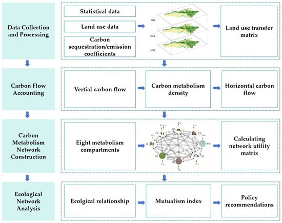 This study presents an innovative framework that integrates a carbon metabolism analysis with ENA to assess the spatio-temporal changes in urban carbon metabolism within the BTHUA. This integrated approach allows for a systematic evaluation of the complex interactions between different urban land use types and their associated carbon flows, providing a more holistic understanding of urban carbon dynamics. Specifically, this study advances existing research by (1) explicitly incorporating ENA to analyze the ecological relationships within the carbon metabolism network, moving beyond the simple quantification of carbon flows; and (2) providing targeted policy recommendations based on the identified ecological relationships.