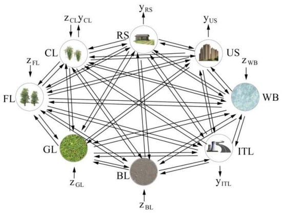 Carbon flow within and between the compartments (CL: cropland, US: urban settlement, ITL: industrial and transportation land, RS: rural settlement, FL: forest land, GL: grassland, WB: water body, BL: barren land).