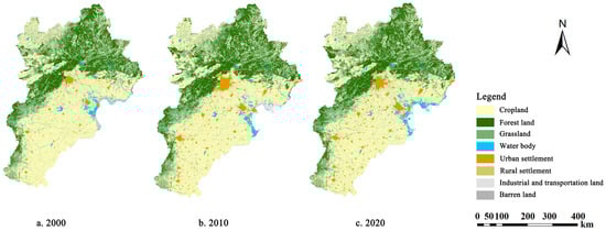 Cropland encompassed the largest portion of area, followed by forest land, grassland, and rural settlement, while water bodies, urban settlement, industrial and transportation land, and barren land accounted for comparatively smaller areas (Table 8). The area of cropland experienced a notable reduction from 2000 to 2020, with an overall decrease of 8.6%. In contrast, the areas of forest land, industrial and transportation land, and rural settlement increased consistently. Concurrently, urban settlement expanded from 2000 to 2010, surpassing twice its original area, followed by a slight decline. The area of water bodies diminished from 2000 to 2010, and then increased. The areas of forest land and grassland remained relatively stable over the study period.