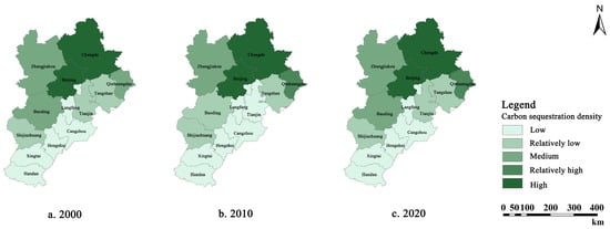 In general, the average carbon sequestration density in the BTHUA increased from 2000 to 2020. The areas of Chengde and Beijing with highest carbon sequestration densities covered 24.9% of the total area in this region. Qinghuangdao was the only city with relatively high carbon sequestration densities in 2010 and 2020. Baoding and Tianjin experienced a decrease in the carbon sequestration density, followed by an increase. Six cities, including Langfang, Cangzhou, Hengshui, Xingtai and Handan, remained at low carbon sequestration densities during the study period.
