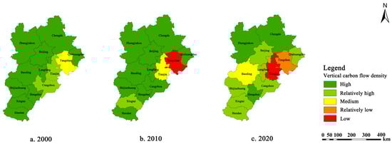 The vertical carbon flow density was calculated by dividing the vertical carbon flow by the area. The values were classified into five levels based on the Natural Breaks (Jenks) method: low (−8 × 103~−6.41 × 103 t·km−2), relatively low (−6.4 × 103~−4.81 × 103 t·km−2), medium (−4.8 × 103~−3.21 × 103 t·km−2), relatively high (−3.2 × 103~−1.61 × 103 t·km−2), and high (−1.6 ~0 ×103 t·km−2) (Figure 7). The negative vertical carbon flow density values indicated a comprehensive manifestation of carbon emissions in the BTHUA. Tianjin and Tangshan have been identified as cities with the lowest vertical carbon flow densities. The vertical carbon flow densities in Zhangjiakou, Chengde, and Hengshui remained stable and high throughout the study period. Eight cities, including Tianjin, Beijing, Baoding, Xintang, Handan, Shijiazhuang, Qinghuangdao, and Langfang, experienced a decrease in vertical carbon flow densities.