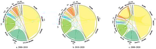 The land use transfer for the entire study period revealed that the area of cropland the transformed into other types remained the most substantial (Figure 8), which was followed by the transfer from grassland to other land uses. Cropland was mainly shifted to rural settlement. Grassland was converted to forest land and cropland. The smallest area of transfer was attributed to urban settlement, indicating the relatively effective control over urban expansion. A notable decline in land use transfer activity was observed from 2010 to 2000 compared to the first period.