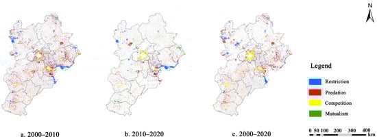 The symbolic matrix (Table 7) was defined to categorize the relationships between compartments into four types: mutualism (+, +), competition (−, −), predation (+, −), and restriction (−, +). This classification allows for a nuanced understanding of how different land uses interact and influence carbon flows within the urban ecosystem [25].