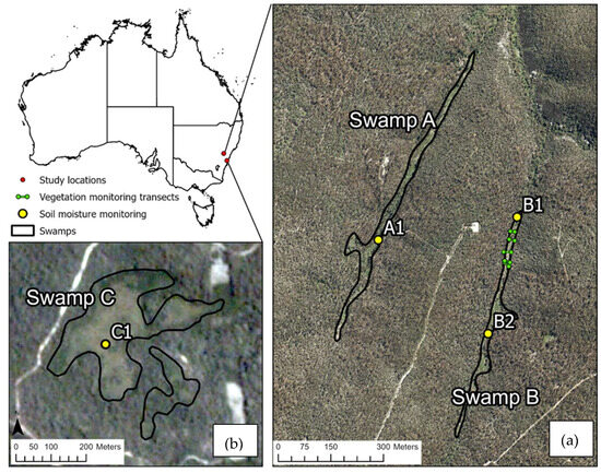 Aerial photo indicating the study locations in (a) Newnes Plateau (mined-under swamps): Swamp A (8.9 ha) and Swamp B (5.09 ha); (b) Upper Nepean (non-mined-under swamp): Swamp C (9.02 ha). The green points on Swamp B represent the vegetation monitoring transects. A1, B1, B2, and C1 represent the soil moisture monitoring points.