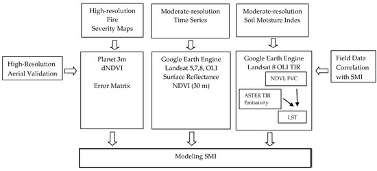 Landsat Data: Medium spatial resolution (30 m) imagery was used to estimate LST, which served as an input for calculating SMI. Bands 10 and 11 from Landsat 8 were used for thermal radiance measurements, with adjustments for surface emissivity. Landsat 8 satellite carries the Operational Land Imager (OLI) and Thermal Infrared Sensor (TIRS). The imagery was retrieved from Google Earth Engine and USGS Earth Explorer. The spatial resolution of the multispectral bands was 30 m, and the thermal bands had a 100 m resolution, resampled to 30 m. The revisit time for Landsat 8 is 16 days, with available data spanning from [2019–2023]. These images cover both pre- and post-fire periods for monitoring vegetation and soil moisture recovery.
