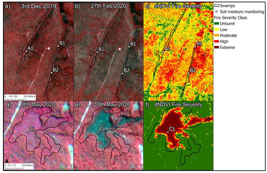Planet satellite imagery showing (a) CIR pre-fire; (b) CIR post-fire; (c) classified fire severity map using dNDVI on the Swamp A and Swamp B from the Newnes Plateau; (d) CIR pre-fire, (e) CIR post-fire; and (f) classified fire severity map using dNDVI on the Swamp C from Upper Nepean.