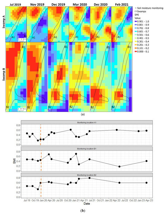 Soil moisture index (SMI) fluctuations in Newnes Plateau study swamps: (a) SMI maps of Swamp A and Swamp B topsoil from July 2019 to February 2021 and (b) SMI time series for topsoil of studied sites in Newnes Plateau (monitoring locations A1, B1, and B2) (the wildfire occurred in December 2019).