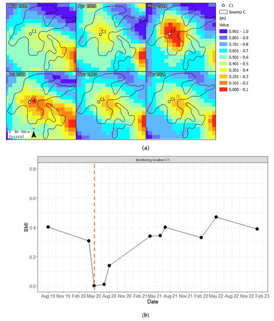 Soil moisture index (SMI) fluctuations in Upper Nepean study swamp: (a) SMI maps of Swamp C topsoil from August 2019 to April 2021 and (b) SMI time series for topsoil of the studied site in Upper Nepean (monitoring location C1). The dotted red line represents the fire event for the location (the wildfire occurred in May 2020).