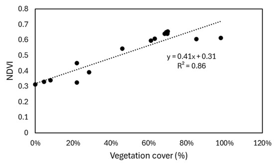 Figure 9 shows the comparison of NDVI values with field-surveyed vegetation cover data from the five monitoring transects, as indicated in Figure 1. The correlation coefficient (R2) was 0.86 (n = 17), suggesting that the NDVI data time series and NDVI maps effectively represent variations in vegetation cover.