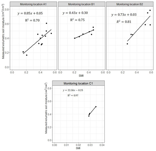 A strong correlation was observed between the measured soil volumetric moisture contents in 10 cm soil depth and SMI values, in which the correlation coefficient values were 0.7 (n = 13), 0.75 (n = 7), 0.8 (n = 8) and 0.97 (n = 5) for sites A1, B1, B2, and C1 (Figure 10).