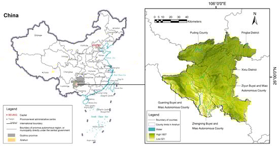 Anshun, located in the mid-western part of Guizhou Province in southwestern China, is situated between 105°13′~106°34′ E and 25°21′~26°38′ N (Figure 1). It is an important watershed area between the Wujiang River Basin of the Yangtze River system and the Beipanjiang River Basin of the Pearl River system, with a total area of 9267 square kilometres and a total population of 3 million people. Anshun is part of the Qianzhong hill plain basin in the western plateau mountain region of Guizhou. The topography of the city is complex and varied, mainly dominated by karst landforms, accounting for 77.82%, which is a typical karst landform concentration distribution area in the world. Anshun belongs to the western part of the subtropical humid monsoon climate zone, there are often valley winds and summer winds in the territory, and there are many clouds and rain, cool, humid, low solar radiation, and the air quality is excellent at 99.8% all year round. The city’s tourism resources account for 12% of the city’s total area, much higher than the national average of 1% and Guizhou Province’s 4.2% and is the earliest identified Class A tourism open city in China. Anshun is also a famous historical and cultural city in Guizhou, with unique historical and cultural heritage such as Tunbao, pierced cave and Yelang cultures. In recent years, to cope with the increased development of tourism, Anshun has made great efforts to improve infrastructure construction, with the Shanghai-Kunming Expressway running across the east and west, the Guiyang-Kunming Railway crossing the whole territory, and the Shanghai-Kunming High-speed Railway already having several stations in Anshun.