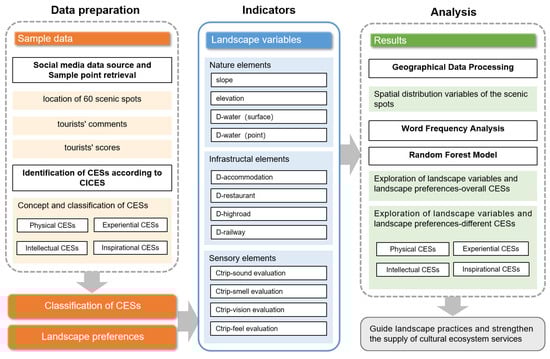 To explore how landscape variables affect different CESs, an indicator that evaluates the results of that effect is also needed—landscape preferences. Landscapes are areas perceived by people, and the central component of landscape value is based on human perception [33]. Landscape preference usually reflects society’s perceived preference for a particular landscape and is the result of a combination of perceptual activities, such as the public’s emotional perception when confronted with the landscape [32]. Based on the attention restoration theory (ART) [34], different people perceive the same landscape differently, so landscape preferences are influenced by personal interests, differences in social and cultural backgrounds, and educational attainment [35]. Currently, some Chinese social media platforms, such as Ctrip, Tuniu and Where to go, can provide a large amount of data on tourists’ reviews and ratings of landscape preferences [33], including their comments on the features, advantages and disadvantages of the attractions, as well as their subjective feelings (e.g., service quality, comfort, environmental quality, etc.), which can provide valuable data for assessing the public’s landscape preferences. It can be a promising idea to understand CES by examining the public preferences using social media [36] and the landscape variables that influence them to each CES [37].