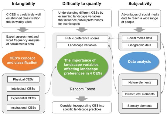 With the advancement of urbanization and the improvement of people’s living standards, society’s requirements are gradually shifting from material requirements to non-material requirements, such as the pursuit of spiritual delight and the desire to be close to nature [1,2]. This shift is motivating an increasing number of individuals to travel to see nature up close and cherish the landscape’s intangible benefits. Governments and society are therefore paying more attention to the inclusion of cultural ecosystem services (CES), which represent the intangible advantages of ecosystem services (ES), as a reference indicator for ecosystem valuation [3]. To inform the next stage of landscape planning and policy making, it is essential to establish communication between CES and landscape variables in order to collect scientifically sound information.