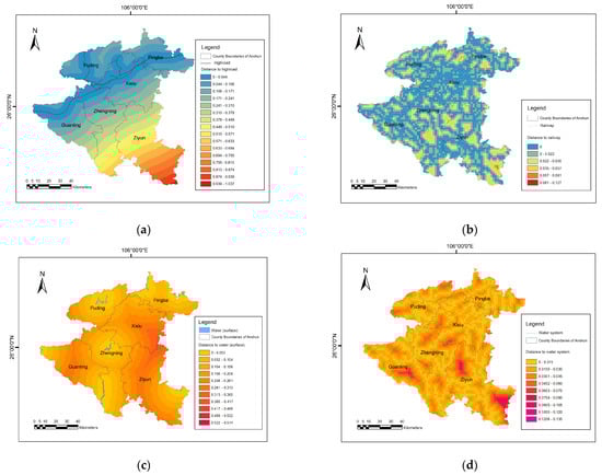 Spatial landscape characteristics: (a) Distance to the highroad; (b) Distance to the railway; (c) Distance to the water surface; (d) Distance to the water system.