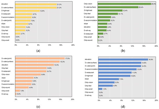 Twelve landscape character indicators were used as inputs to the Random forest to predict public landscape preferences for different CESs. Figure 8 and Figure 9 illustrate the proportion of importance of each feature.