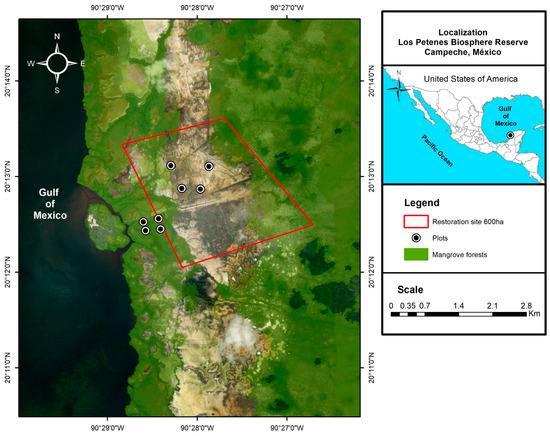 In this study, a 600-hectare area of deceased mangrove was selected for the application of ecological restoration techniques (20°12′48.79″ N, 90°28′3.06″ O) and methods, in March 2012. The process included hydrological rehabilitation achieved through the construction of an artificial canal network, actively involving four Mayan communities. Additionally, reforestation actions were implemented using the aerial seeding method with Avicennia germinans propagules. The soil texture in the restoration area was characterized as loam, with 21–36% sand, 38–63% silt, and 13–26% clay. The reference forest was categorized as silt-loam, with 11–27% sand, 64–65% silt, and 9–23% clay.
