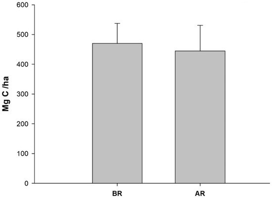 The carbon sequestration in the restoration area (RA) and the reference forest (BR) did not show significant differences (p > 0.05) between the study sites (Figure 2, Table 1), despite the recording of a higher concentration in the reference forest (BR). This higher concentration in the reference forest compared to the restored forest may have been associated with the high soil carbon rates that characterize old-growth forests [3] and by their stronger forest attributes. In addition, the dominance of A. germinans and presence of R. mangle and L. racemosa create suitable conditions for carbon sequestration [28,29,30]. The soil carbon sequestration at a depth of 30 cm in the mangroves in this study was similar to that reported at different sites in the state of Campeche by authors such as [1,31,32] (Table 1). This could have been due to environmental conditions, such as hydroperiod behavior, soil dynamics, and mangrove species productivity [33,34,35]. On the other hand, the carbon sequestration results were higher than those reported in some mangrove forest sites in Mexico [12,23,36,37], the United States, Costa Rica [38], Indonesia, Bangladesh, and Mozambique [14,39].