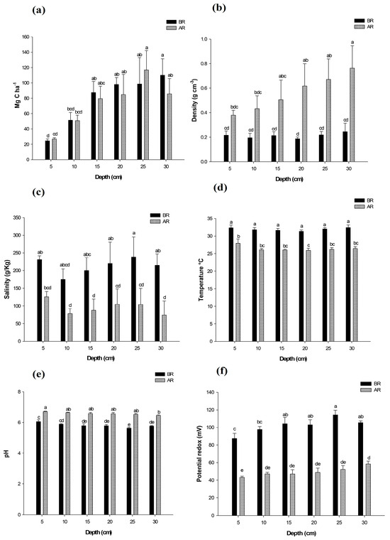 Carbon sequestration (a), density (b), salinity (c), temperature (d), pH (e), redox potential (f) (average ± standard deviation) at different depths in sites of the reference forest and restoration area. Error bars that do not share a letter are significantly different (p < 0.05).