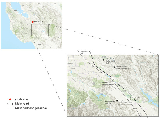 The study delineates a 30 km radius (approximately 18.64 miles) from the Calero Reservoir as its focal area, located 20 km (about 12.43 miles) from downtown San Jose, CA. The Calero Reservoir, a crucial hydrological feature for the region, supports the surrounding ecosystems with ample water resources. Figure 1 illustrates several designated wildlife preserves within the study site, including the North Coyote Valley Conservation Area, Tulare Hill Ecological Preserve, and Basking Ridge Conservation Area—integral to the region’s biological diversity. The area boasts a rich ecological mosaic of forests, grasslands, and watersheds, providing habitats conducive to a variety of wildlife species, including several protected ones. In recent years, a surge in roadkill events has been observed, particularly at the confluence of Highway 101 and Monterey Road (refer to Figure 1), with significant repercussions for human safety, bobcat populations, and the broader ecosystem integrity.