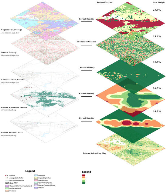 This study employed the Kernel Density method to process Vegetation Coverage data. Kernel Density Analysis uses kernel functions (such as the Gaussian kernel) to interpolate data points, forming a continuous density surface, thus accurately capturing variations in vegetation coverage on a small spatial scale. Bobcats prefer complex natural vegetation structures [17] and their presence is often associated with open water bodies, developed open spaces, grasslands/herbaceous and shrub/shrub habitats [72]. Forest-type land has a significant impact on the relative abundance of bobcats [73]. Although current research has analyzed the habitat types preferred by bobcats and their characteristics, there is not yet a clear and unified consensus on the preference order of these habitats. Therefore, in this study, we employed a method based on word frequency analysis to count habitat-related keywords mentioned in the literature under the “Vegetation Coverage” category, which are relevant to suitable locations for bobcat crossings. This method aims to quantify the relative importance of different land types for bobcats. Specifically, we classified these keywords into five levels using the Equal Interval method, assigning suitability scores from 5 (highest importance) to 1 (lowest importance) based on their significance, see Table 3.