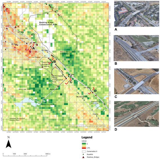 Moreover, incorporating varied perspectives leads to sustainable urban development strategies that embed wildlife conservation into urban planning, promoting a more harmonious and resilient cityscape [47]. This study, through an interdisciplinary lens, evaluates potential bobcat crossing sites within San Jose’s urban matrix.