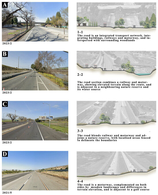 Figure 3 shows that Segment A, being close to the town, has the lowest suitability score. Despite some vegetation, it is primarily urban greenery and close to houses. Segment B, near a water source, has vegetation only on the northeast side and is traversed by a flyover across the main road, resulting in good suitability. Segment C, with open views and belt-like vegetation on both sides, also crossed by a flyover, has slightly lower suitability compared to B. Segment D, farthest from the urban area, with broad views and some vegetation, also shows good suitability in the image. In conclusion, it is found that the suitability of different sections varies due to the different environmental landscapes in their surroundings. However, the same feature is that the habitat suitability is lower in the crossings where there is no advantage of natural resources such as vegetation and water. Whereas the abundance of favorable natural conditions and appropriate tunnel treatments will increase the suitability of the intersection location. In addition, the closer to the urban landscape, the lower suitability even though there are high quality vegetation and corridor bridge. For details, the comparison of the four sections reveals that areas with vegetation on both sides or near a water source have higher suitability, as clearly demonstrated by B and C. Additionally, in similar road environments, the comparison between B and C indicates that more abundant and favorable natural factors lead to higher suitability. This suggests that increasing vegetation around roads and in poorer corridors could be considered to reduce roadkill. Therefore, following this, we will conduct case studies and research based on the characteristics of different intersections (Figure 4), exploring measures to enhance suitability in the area.