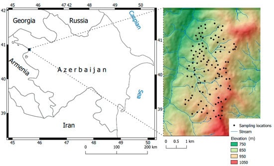 Our research was conducted in the foothill belt of the Caucasus Mountains in Azerbaijan, located between 45.6201° to 45.6401° E and 40.8401° to 40.8701° N. This area is used for agricultural purposes at elevations ranging from 750 to 1020 m (Figure 1). The total precipitation and annual average air temperature are 570 mm and 10.2 °C, respectively. The typical Mediterranean climate encompassing the whole Caucasus region leads to mild and dry winters. Geographically, the study area is related to the transition zone from the semi-arid step zone to the mountainous moderate climate zone. The typical soil moisture regime is xeric, and the dominating soil group is Kastonozem, according to the WRB (World Reference Base) for Soil Resources [39].