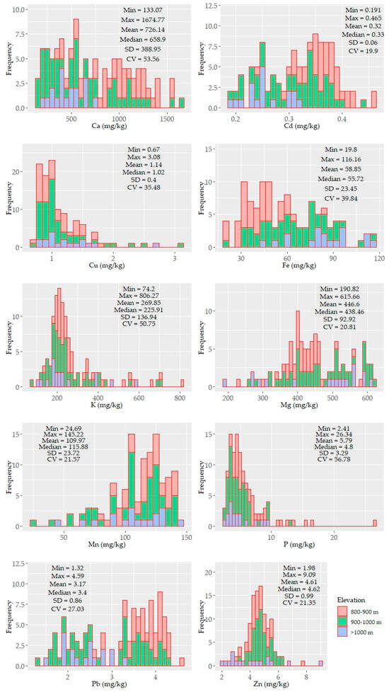 Histograms and descriptive statistics of the tested soil properties (n = 114). The values of the soil properties were color coded in accordance with three elevation levels: 800–900, 900–1000, >1000 m.
