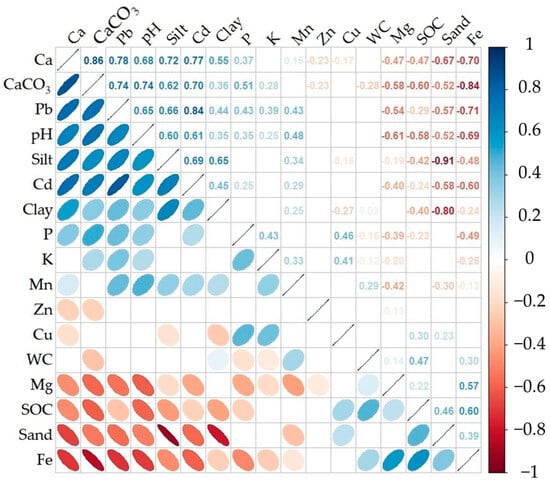 The correlation matrix for the studied soil properties is presented in Figure 3. Significant correlations were found (r = 0.3–0.91, r ≥ 0.4 for half of pairs) between most soil parameters. CaCO3 was found to be significantly correlated with the majority of the soil properties analyzed (excluding Mn and Cu). These relations could be divided into two groups (descending order): (i) positive (Ca, pH, Pb, Cd, silt, P, clay, and K) and (ii) negative (Fe, SOC, Mg, sand, and Zn). Very strong (r > 0.8), strong (r = 0.6–0.8), and moderate (r = 0.5–0.6) negative correlations between CaCO3 and Ca, CaCO3 and pH, Cd, Pb, silt, and CaCO3 and Fe, SOC, sand, Mg content, respectively, were noted (Figure 3). A group of nutrient elements (Ca, Mg, Cd, Fe, and Pb) displayed significant and greater correlations with the basic properties, whereas the other elements (P, Cu, K, Zn, and Mn) mainly exhibited weaker yet significant correlations (Figure 3). As is obvious from the summarized relations, Fe and Mg showed a negative reliance on pH and CaCO3, whereas Pb and Cd showed a strong positive reliance on pH and CaCO3. Meanwhile, high correlations were marked between some nutrients in the soil matrix, including the following: Ca and Cd, Cd and Pb, Ca and Pb, and Fe and Mg. Based on their interrelationships, the analyzed properties can be formally divided into two groups: (i) the first one includes CaCO3, silt, clay, pH, and their dependent elements (Ca, K, P, Cd, Pb, and Mn), and (ii) the second group includes SOC, Fe, sand, and Mg, Cu, Zn, and the second group has intricate relations between elements because of their weaker relationships with others.