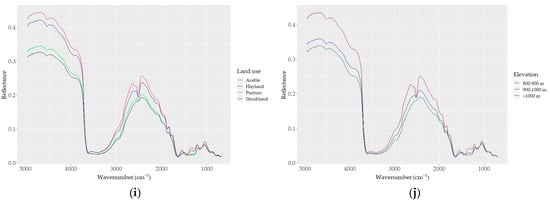 The sample spectra showed higher reflectance and larger variability in shorter wavelength regions (e.g., 5000–4200 cm−1) compared to longer wavelength regions (4200–650 cm−1), where a higher optical density and number of absorption peaks were apparent (Figure 4). The most remarkable steep-sided feature typical in all spectra was observed at around 3625 cm−1 and may be related to the elongating of OH groups in the 2:1 layer. The MIR spectra of all samples, as well the averaged spectra, captured the variability found in the soil chemical data. The averaged spectra with different contents of CaCO3 and SOC, as well with different elevations and land use types, allowed us to differentiate apparent spectral manifestations (Figure 4). The CaCO3 and SOC contents caused variations in spectral reflectance intensity and absorption features; samples containing higher CaCO3 contents showed higher reflectance intensity and absorption features at corresponding spectral bands (Figure 4a–f). A strong absorption feature appeared at 2520 cm−1, and the depth and width of the absorption feature dramatically changed according to the CaCO3 content; the feature was replaced with convex shape for samples with lower contents of CaCO3 (< ~2%) (Figure 4f,g). However, with increasing CaCO3 content, the absorption features showed a pronounced increase in the concave features.