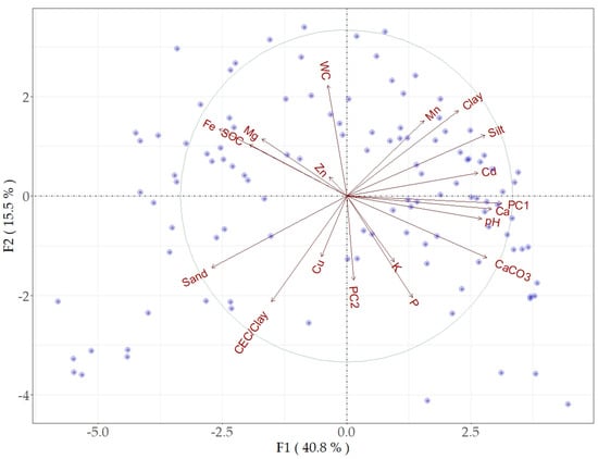 The PCA of the original spectral data, as well as the PCA of the first two principal components, provided a valuable insight into the relations between the spectral data and soil properties. The PCA analysis of the spectral data and soil properties produced a highly discriminating pattern with considerable orthogonality. Almost 90% of the variance of the initial spectral data was explained by PC1 and PC2. The first two components (F1 and F2) accounted for approximately 57% of the total variability (Figure 5). Most of soil properties (CaCO3, clay, silt, pH, Ca, Pb, Cd, and Mn) were associated with PC1, while SOC, Fe, Mg, and Zn showed inverse relation with both PC1 and PC2. The sand, CEC/clay, and Cu contents showed specific orthogonality with other soil properties due to the relations between particle sizes, SOC, and CEC/Clay. WC was inversely related to PC2 and showed orthogonality with most soil properties. All soil properties, except Zn, were nearly proportional to the variability involved in PC1. The pattern of sample distribution far from the biplot origin could be linked to significant variability and performance quality (Figure 5).