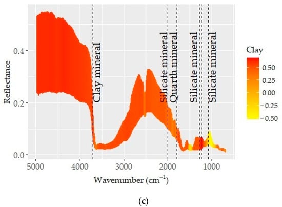 The effect of the sand content on soil reflectance was also evident in its relations to SOC and CaCO3. As sand was positively and negatively correlated with SOC and CaCO3, respectively, the spectra of high-sand-content samples showed low reflectance (Figure 4c). The effect of clay and silt contents on the soil reflectance was similar to that of CaCO3: the higher the clay and silt contents, the higher the reflectance (Figure 4d,e). Both the color-coded and averaged spectra allowed for the discrimination of the spectral features associated with clay minerals between 3700 and 3600 cm−1 and 2000 and 1790 cm−1, as well as the discrimination of the spectral features associated with silicates between 1280 and 1070 cm−1 (mostly quartz; Si–O and silicate, respectively). Furthermore, the absorption bands of organic matter were also evident (aliphatic C–H elongating bands at 2960 cm−1 and 2870 cm−1; amide I and II bands in the region between 1640 and 1400 cm−1).