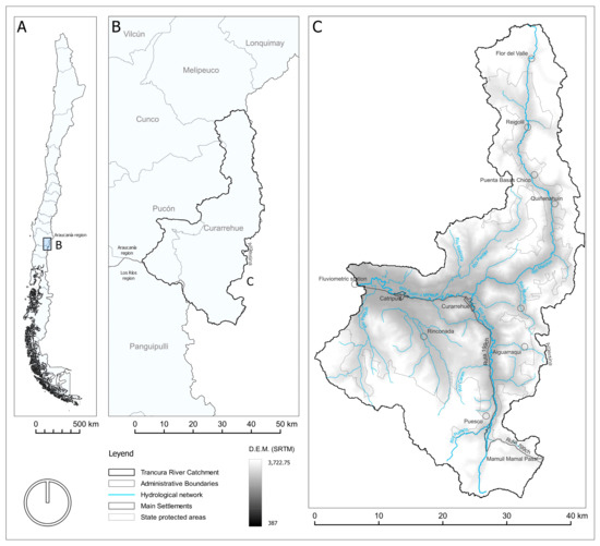 (A) Chile and regional division. (B) Basin and Municipalities (C) Trancura River Basin.