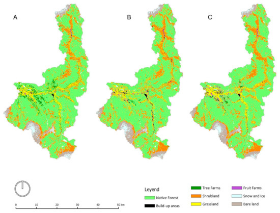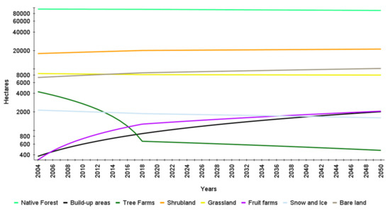 First, a series of land cover maps were generated for the years 2004, 2009, 2013, and 2018, using 30-m Landsat 7 ETM+ and Landsat 8 satellite imagery, following a supervised classification process employing the Random Forest algorithm [101]. The precision of the resulting land cover maps was assessed through comparison to high-resolution imagery obtained from Google Earth. The fourteen land cover classes obtained for a greater area, were reclassified to suit the TRB prominent land classes until obtaining the following set of eight land cover classes: Native Forest (1); impervious surfaces (2); Tree farms (3); Shrubland (4); Grassland (5); Fruit trees (6); Snow and Ice (7); and Bare land (8). Then, the resulting 8 land cover maps were resampled to match the lower 90-m resolution of the topographic data obtained from the USGS Shuttle Radar Topography Mission (SRTM) [102]. Watercourse areas are assumed to remain unchanged throughout the simulation and remain as a NULL value. The simulation of land cover change used only the 2004 and 2018 maps, whereas 2009 and 2013 were used for quality control purposes. Initially, the fruit tree class was merged with the grassland class due to its small quantity, but it was later separated into a distinct land use class based on interview feedback. Also, the identification of Build-up areas, which are essential for human settlements, was adjusted based on the interviewee’s feedback. The change amounts for every land class from 2004 to 2018 are exposed in Table 2.