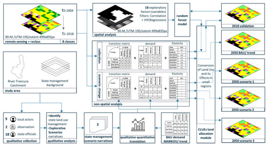 This research considers LULCC as a spatial reflection of the historical dynamics of the social, political, economic, and ecological context of the study area. In this sense, our methods build from the concept of state rescaling, which holds that the current land use patterns reflect a site-specific state intervention that are influenced and complemented by market forces, local actors, and other anthropogenic factors. Section 2.1 provides a general description of the study area and a listing of the prominent institutions responsible for managing land use activities. Section 2.2 describes the participatory methodology used to develop plausible future scenarios build on trends described by stakeholders with essential roles within the system [79]. The hierarchical structure of the Chilean state involves policymakers at the top and lower-level officials responsible for enforcement and decision-making at the bottom. In this work the focus is put on the latter, as their decisions during the implementation phase have a substantial impact on its final outcomes [80]. Additionally, it is complemented by key stakeholders involved in the main land use activities in the study area. Section 2.3 describes all the data processing required for implementing the Conversion of Land Use and its Effects (CLUE) model. Finally, Section 2.5 describes the development of four future land use scenarios up to 2050.