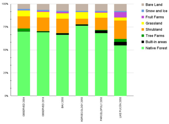 Grassland, representing traditional agricultural and ranching practices, reaches the maximum capacity based on historical land cover records. In the Like Pucón scenario, grassland diminishes by half.