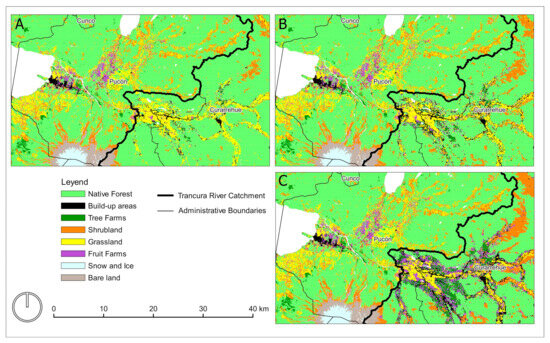 The Trancura River basin (TRB) is located (Lat. 39°20′24″ S, Long. 71°34′12″ W) in the southeast of the Araucanía region in southern Chile (Figure 1). This mountainous basin has a pluvio-nival hydrological regime [81], with elevations ranging from 353 to 3740 m.a.s.l. It has a drainage area of 1402 km2, defined at the “Trancura River antes de Llafenco” streamflow station. It is characterized by a large native forest cover at the Andes Mountains’ foot [82]. Due to the ongoing dynamics, LULCC modeling in the Trancura River Basin is highly relevant.