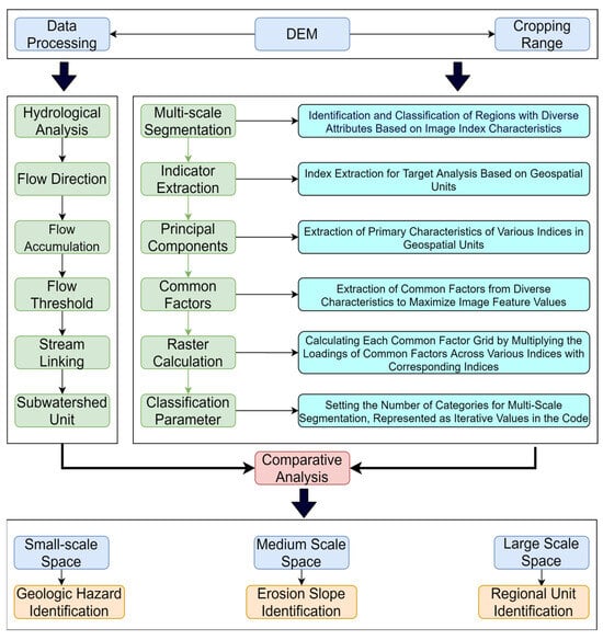 The second part utilizes the multi-scale segmentation method. Firstly, utilizing the acquired elevation data, the necessary index factors are calculated. Secondly, principal component extraction is applied to each indicator’s loadings. Thirdly, by employing factor loadings, different principal component grids are calculated. This involves multiplying the factor loadings of various indices in the first principal component by the index factors, then summing the resultant grids to form the first principal component grid. The second principal component grid is derived in a similar manner. Fourth, land parcels are extracted using the multi-scale segmentation method. Finally, the extracted land parcels are classified, the original indicators are cropped, and mathematical statistics are performed. It is important to note that when the resolution and range of the calculated index factors differ, it is necessary to use DEM (Digital Elevation Model) elevation data as the reference dataset and resample the other index factors accordingly.