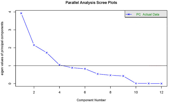 In this study, the mean eigenvalues were calculated based on 100 random data matrices. Principal components were extracted based on eigenvalues greater than 1. Scree plots of eigenvalues and principal component charts were drawn to clearly define the range of principal component variations. To facilitate the easier interpretation of the component loading matrix and to denoise the components as much as possible, varimax rotation was applied to the loading matrix, allowing each principal component to be explained by a limited set of variables. The findings indicate that four common factors can be extracted for all indicators [] (Figure 2).
