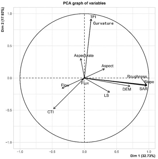 Based on the classification of principal components (Figure 3), the first principal component is primarily contributed by indicators such as elevation, roughness, surface area ratio, and slope. These four indicators mainly relate to the smoothness of the land parcels. The second principal component is mainly contributed by surface curvature and the Topographic Position Index (TPI), which primarily measure the overall undulation of the terrain. The third principal component’s main contributors are aspect, slope aspect variability, and flow direction, which are more related to the continuity of the land parcels. The fourth principal component’s main contributors are flow accumulation and the Compound Topographic Index (CTI), mainly illustrating the cumulative flow conditions of the land parcels.
