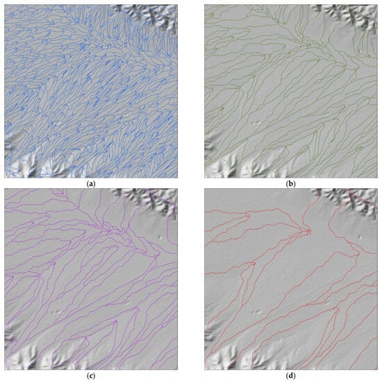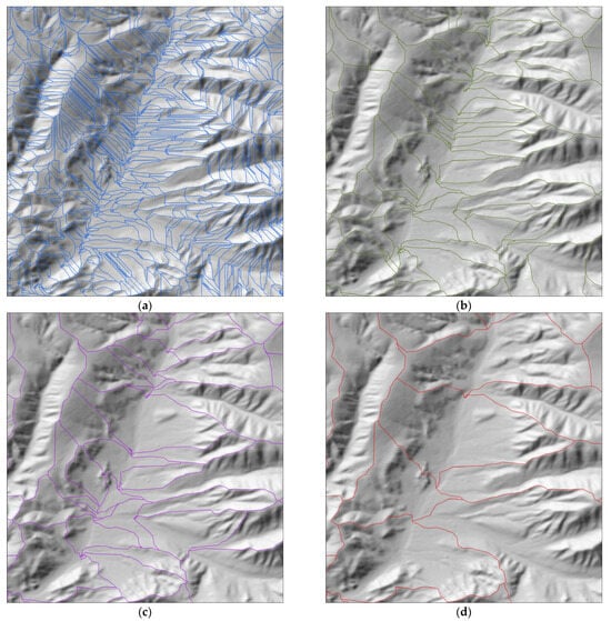 In summary, as the threshold value increases, the area of the extracted land parcels becomes smaller. Although internal consistency in flow direction is not evident, significant differences in terrain undulation and upstream–downstream runoff are observed, which are of great importance for the analysis of geological disasters and local areas.