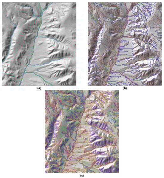 Different geomorphological units are analyzed at the micro and meso scales. Analyzing the catchment units under different thresholds reveals the following patterns (Figure 5 and Figure 6). First, the variation in catchment area extent is associated with changes in threshold values. As the threshold increases, the catchment area will encompass those of smaller thresholds, increasingly ignoring micro-geomorphological structures during the merging process. Second, rivers are the concave parts of the catchment units, with the entire catchment unit being a concave trough-like structure centered around the river. Third, river structures become sparser with increasing thresholds. Fourth, since hydrological extraction is based on elevation data, conclusions drawn from hydrological analysis in plain areas have limited practical significance for actual research. Fifth, each catchment area is an independent unit, and there is no attribute field that can categorize catchment areas with similar attributes into the same class.