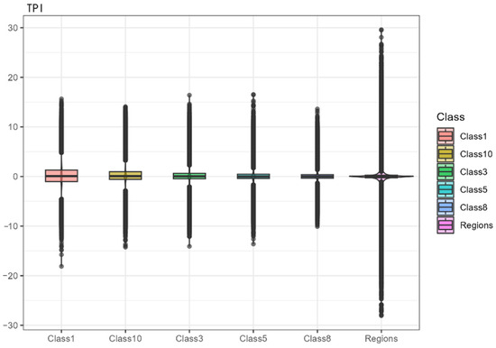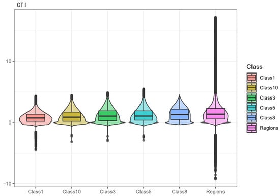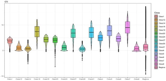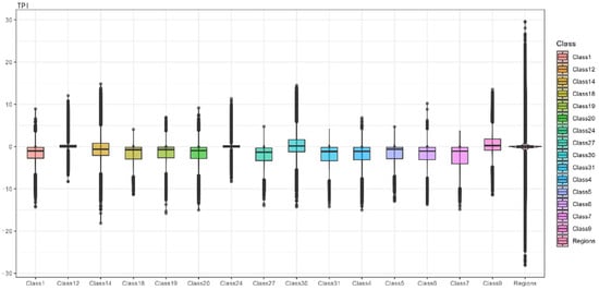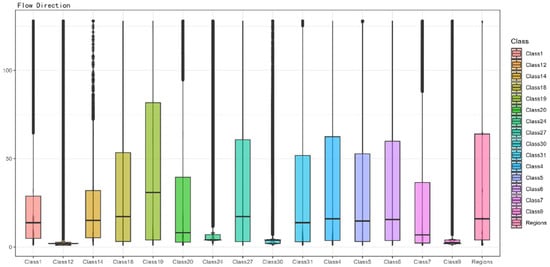 Firstly, a comparison within the study area revealed that the flow direction of the 15 types of land parcels did not show significant differences (Figure 12), except for four types where the flow direction was more concentrated. Secondly, the Topographic Position Index (TPI) indicated that the extreme values of all 15 types of land parcels were smaller than the entire study area (Figure 13). For instance, in Classification 9, the mean value is 0.55 with a standard deviation of 2.28. Classification 12 exhibits a mean value of 0.23 with a standard deviation of 1.18, suggesting internal consistency in terrain undulation. Lastly, the Compound Topographic Index (CTI) revealed significant differences in upstream and downstream runoff relationships among the 15 types of land parcels. In the case of Classification 9, the mean value is 0.83 with a standard deviation of 0.89. Conversely, Classification 30 exhibits a mean value of 0.69 with a standard deviation of 0.76. These statistics indicate good internal consistency within Classification 30, which is crucial for analyzing local geological disasters such as landslides, collapses, and mudflows (Figure 14).