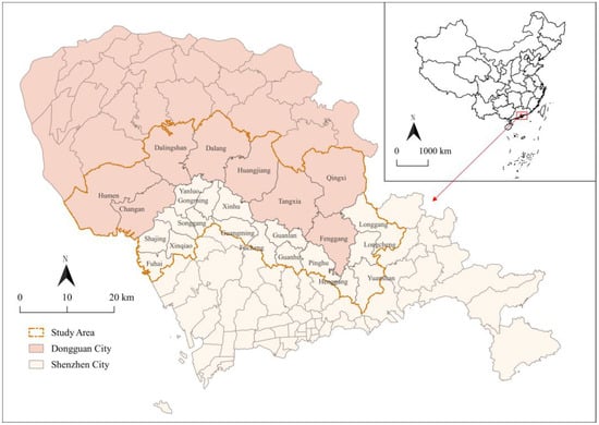 In the context of the regional integration and coordinated development of the Guangdong–Hong Kong–Macao Greater Bay Area, China, cross-boundary regions such as Guangzhou–Foshan and Shenzhen–Dongguan have rapidly developed, with relatively little attention having been paid to the latter region. Shenzhen is located at 114.07° E, 22.62° N, and Dongguan is located at 113.75° E and 23.04° N. The total area of Shenzhen is 1997.47 square kilometers, with a permanent population of 177,761,800 in 2022, while the total area is 2542.67 square kilometers in Dongguan. By the end of 2022, Dongguan had a permanent population of 10.437 million. Shenzhen and Dongguan have strong complementarity and obvious integration characteristics, and they are representative of integrated regions. With the acceleration in the construction of the Shenzhen metropolitan area, Dongguan and Shenzhen will usher in a new era of deep integration, and the two cities will realize all-round integration and development; they will join together to build a pole in the global Bay Area economy, which will also become the focus of academic attention. Therefore, this study delineates the research scope based on townships near the administrative boundary of Shenzhen and Dongguan, including 25 towns with an area of approximately 1547.56 square kilometers. Shenzhen includes 17 subdistricts with an area of 577.56 square kilometers, accounting for 37.32%; Dongguan includes 8 towns with an area of 969.99 square kilometers, accounting for 62.68% (see Figure 1).