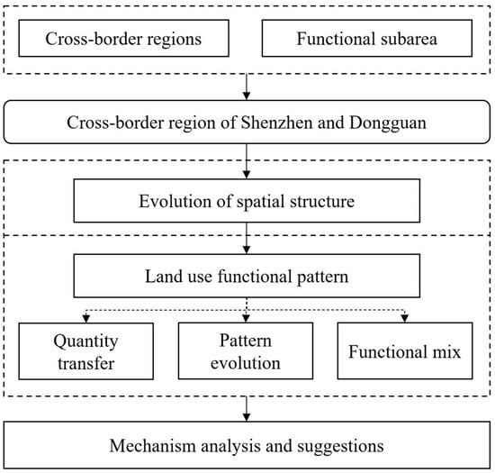 In the context of coordinated and high-quality regional development in China, urban functional zones have expanded beyond their original administrative boundaries, and the cross-boundary region has become a new spatial pattern. Under the influence of market factors, there are economic, transportation, social, cultural, policy, and other connections between the different administrative entities. Cross-boundary regions have more complex spatial characteristics, and the evolution of their spatial patterns is a comprehensive reflection of the flow of elements between different administrative entities and the evolution of a system structure, which is a concrete manifestation of the complex interactive process of the human–land system [2]. The identification of factors that influence the evolution and dynamics of regional spatial structure has become an effective means of understanding the laws of regional development. Studies have been conducted to measure the spatial structure of the region through commuting flows, employment density, population density, and land use function [3]. In particular, classifications of the urban land use function are of great importance for the spatial structure [4]. The patterns formed by the proportion of land use function types in terms of quantity and their mutual positional relationship in space are an important manifestation of spatial structure. The existing literature focuses mainly on cross-border space on national and subnational scales, with little attention paid to land use and spatial change on regional and subregional scales. Most of the studies are centered on changes in built-up and non-built-up land, focusing more on the ecological functions of the land and less on the changes in the functions of urban built-up land. In addition, the existing research on functional zoning recognition is limited to a single time node and lacks analysis of the influencing factors. Based on this, it is necessary to overcome the statistical barriers to investigate cross-boundary areas’ spatial and temporal features on subregional scales and explore the influencing factors through practical situations such as marketization background, relevant policies, and planning texts.