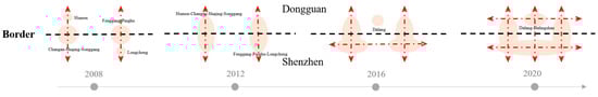 By 2020, Shenzhen had formed a balanced and high-speed development, while Humen Chang’an, Dalang Dalingshan, and Tangxia Fenggang on Dongguan had become three development clusters in the east, middle, and west, further achieving balanced growth, which is in line with the balanced evolutionary characteristics of the regional spatial structure of “point-axis-network” (see Figure 3) [49].