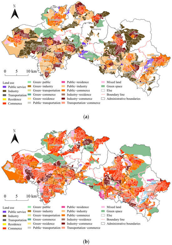 (2) The land use functions are gradually showing a trend of diversification, mixing, and dispersion, with a significant increase in mixed-function land. The layout of commercial services, public services, green squares, transportation facilities, and other land uses is more dispersed and balanced, in line with urban development policies such as composite utilization of land uses, integration of industrial and residential land, and the construction of community living circles under the people-centered orientation.