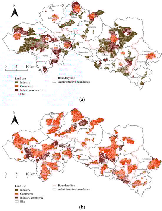 Against the backdrop of the transformation and upgrading of traditional industries and the innovative development of emerging industries, the demand for land use has changed, showing a shift from the horizontal industrial flat layout to the vertical industrial three-dimensional layout, as well as a shift from a single independent functional structure to a mixed interactive functional space. Among these changes, relevant policies propose requirements for the integration of industries, especially secondary and tertiary industries. To be more specific, it is recommended to increase the supply of mixed industry land and further strengthen the layout of industrial land, guiding the aggregation and layout of high-quality resources and major projects [55]. For example, the relevant policy positioning of Humen Town is as a convergence center of both modern services and advanced manufacturing. Promoted by the policy, Humen Town is actively exploring the integration of the second and third industries, specifically including the construction of industrial R&D, exhibition, and marketing centers, as well as creating a modern industry cluster involving headquarters’ economy, R&D, design, and business exhibitions.