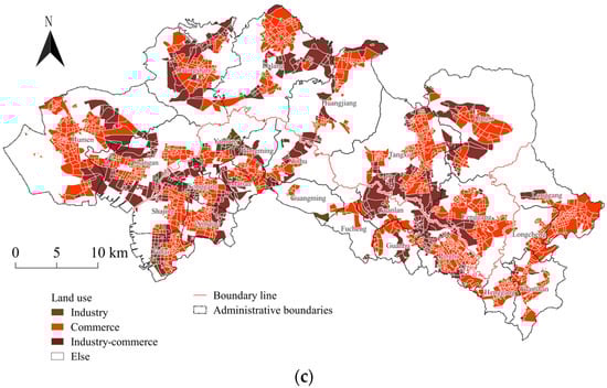 (3) The layout of industrial land is characterized by the cross-boundary expansion of commercial land and the transformation from large-scale industrial land into industrial–commercial composite land, whose concentration is at the edge of two cities. This evolutionary trend is a reflection of the integration of the secondary and tertiary industries, in line with the needs of new industrial land use (M0) and industrial integration.