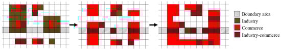 Regional cities are complex entities composed of various functional elements such as industrial, residential, services, and transportation. The evolution of a city’s spatial pattern of urban land use is the result of the combined effects of market factor flow, social integration, natural obstacles, and administrative regulation, making their spatial characteristics more complex. The spatial distribution, proportion, and mutual influence and interaction of various functions at different scales constitute the characteristics of urban spatial structure, which affect the final form and operational efficiency of the spatial structure. Accordingly, the accurate delineation of urban land use is an important tool for understanding urban spatial structure and deciphering planning problems. With the emergence of mega-city regions, the urban functional elements have flourished and spread beyond their original administrative boundaries [25]. In cross-boundary areas, the distribution and proportion of urban residential land, public green spaces, commercial land, industrial land, and other land uses show different characteristics from the urban center, reflecting the separation, transition, and intersection of social, economic, cultural, and governance elements on both sides of the administrative boundary.